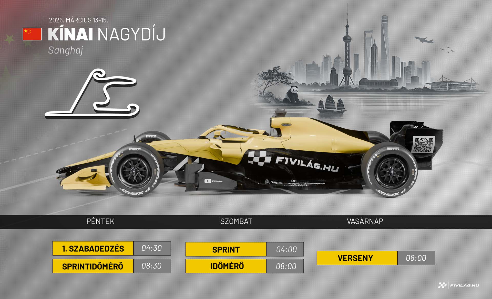 Az időeltolódás miatt nekünk, magyaroknak ezúttal is a reggeli órákban kell figyelnünk az eseményeket: a sprintfutamot szombaton hajnali 4 órakor, az időmérőt 8 órától rendezik, és maga a verseny is vasárnap reggel 8 órakor rajtol. Az M4 Sport ezúttal is a teljes versenyhétvégét képernyőre tűzi, az F1VILÁG.HU-n pedig egész hétvégén folyamatosan tudósítunk a kínai eseményekről.