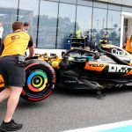MIAMI, FLORIDA - MAY 03: Mechanics in the Pitlane with the car of Lando Norris of Great Britain driving the (4) McLaren MCL39 Mercedes during qualifying ahead of the F1 Grand Prix of Miami at Miami International Autodrome on May 03, 2025 in Miami, Florida. (Photo by Sam Bloxham/LAT Images)